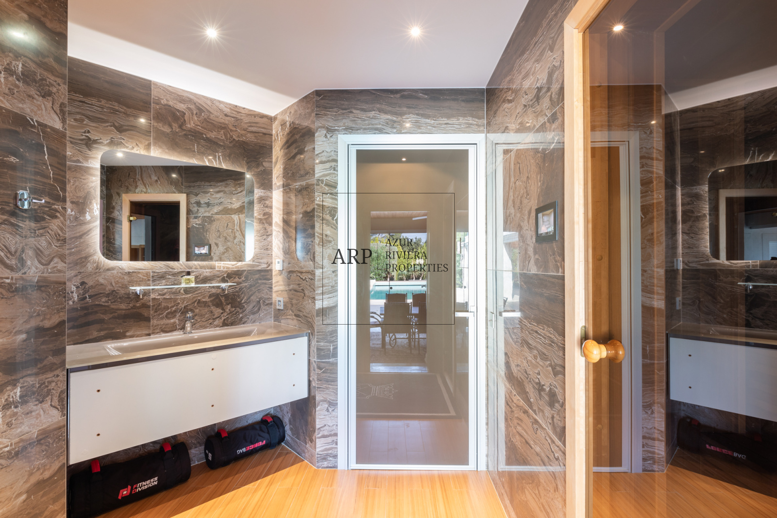 A l’extérieur, vous pourrez profiter du climat méditérannéen grâce à un superbe espace cuisine d’été, un espace bien-être, un sauna et une douche. Cette villa de luxe propose une magnifique piscine ornée de mosaïques avec un volet électrique transparent et un jardin soigneusement aménagé avec son abri pour trois voitures.